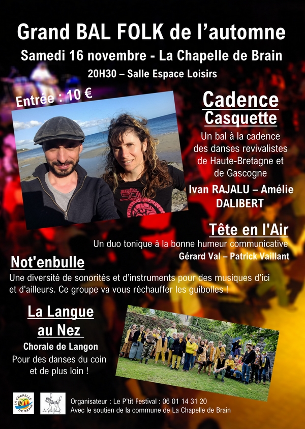 Le Grand Bal Folk de l’automne restera dans les mémoires. Après plusieurs années d’absence, le P’tit Festival revenait en force avec ce grand évènement d’automne. Dans une salle comble de 250 personnes provenant d’horizons divers, et d’âges très variés, certains venus de loin : Quimper, Fougères, Nantes, Angers… Le public était heureux d’être là, dans un vrai moment de partage, des rires et des sourires sur tous les visages, de la bonne humeur partout. Un plateau artistique de plus de 40 musiciens et chanteurs, dont la chorale de Langon, la Langue au nez, le duo/trio Cadence Casquette, le groupe Not’enbulle, et le duo Tête en l’Air. Une organisation irréprochable, un accueil chaleureux, un son de qualité, une salle confortable… Tous les ingrédients étaient réunis pour le plaisir de danser. Et cela grâce à une formidable équipe de bénévoles hyper-motivés. Bref, une soirée réussie sur tous les plans. Nous n’avons qu’une hâte : organiser la seconde édition !